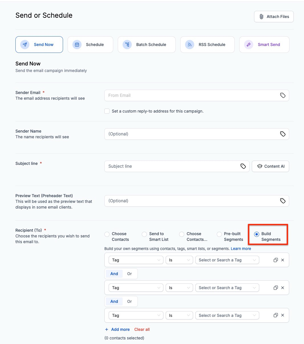 1. Open a campaign in new or edit mode, go to the "Send" or "Schedule" screen, and click "Build Segments" in the recipient section.
