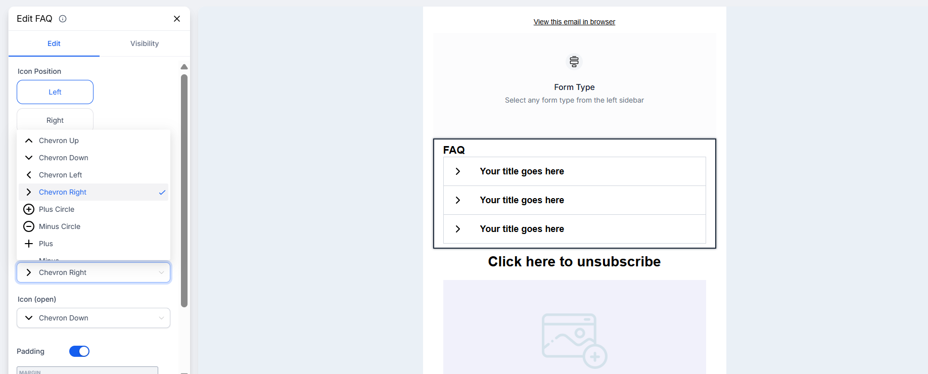 Answer: To customize icons in the FAQ Element, click on the element or the pencil icon to edit. From there, you can choose different icons for the open and closed states and adjust padding for a more refined appearance.
