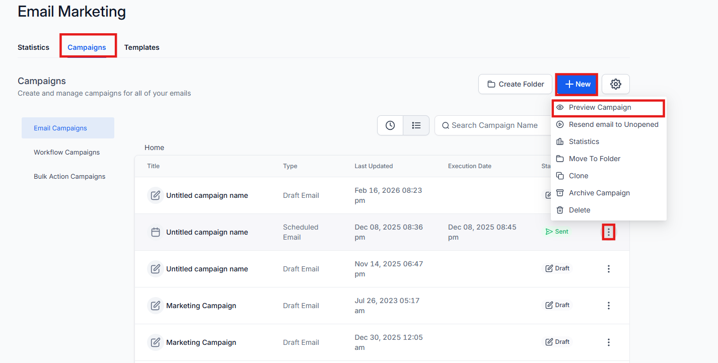 - Go to Marketing & Sales > Email & Social Media > Campaigns.