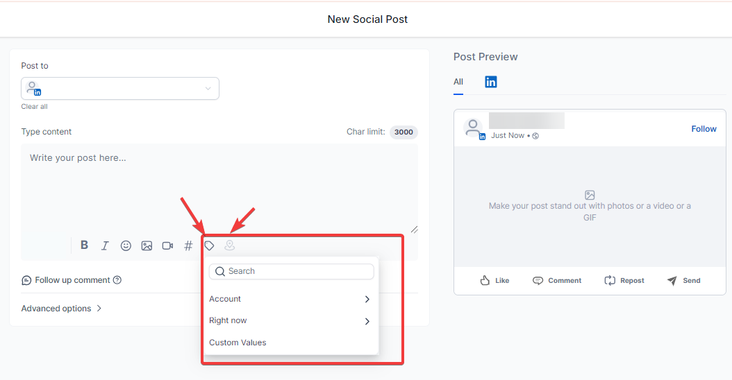 Add dynamic content like names or dates in posts using custom values for personalized engagement.