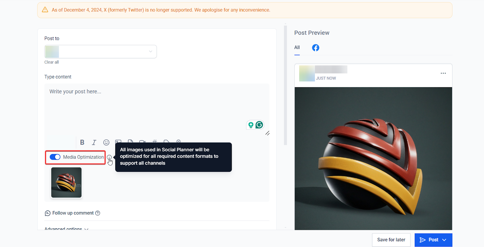 4. Media Optimization: Automatically resizes and formats images to meet platform-specific requirements. It is toggled on by default.