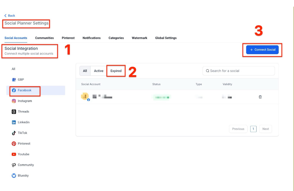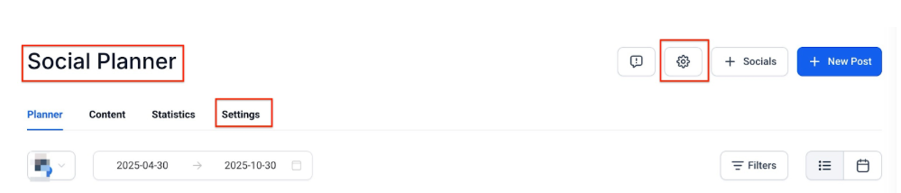- Click on the gear icon to go to Social Planner settings and from there> connect to Facebook