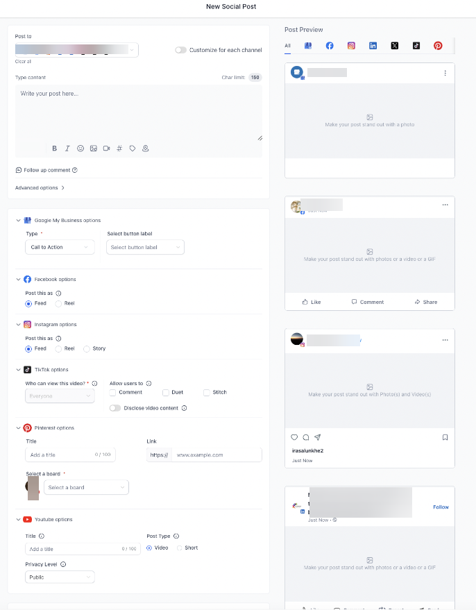 - During post creation, Users can create a single post that includes both images and videos, allowing simultaneous scheduling across platforms like YouTube, Instagram, and TikTok, saving time by avoiding multiple individual posts.