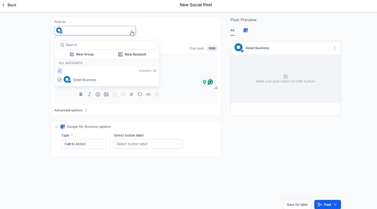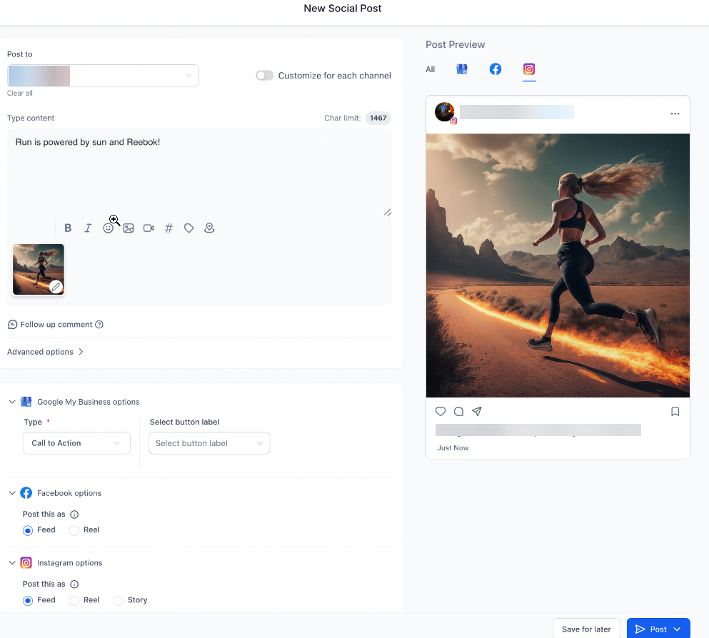 - Multi-Platform Preview: If you're posting to multiple social media platforms (e.g., Facebook and Google My Business), you can toggle between previews at the top. This ensures your content is tailored for each platform.