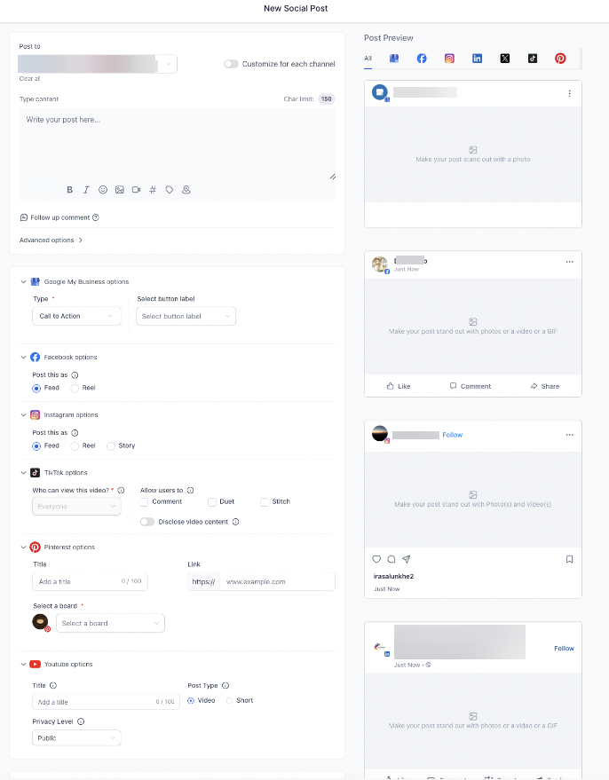 - Alternatively, Users can create a single post that includes images and videos, allowing simultaneous scheduling across platforms like YouTube, Instagram, and TikTok, saving time by avoiding multiple individual posts.