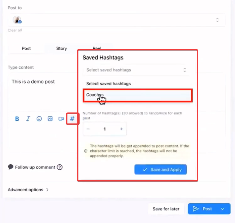 - Create Group Hashtags: Create and save groups of hashtags for easy reuse in posts. This saves time and effort while boosting post visibility and reach to a broader audience. Select from saved hashtag groups to add them quickly to your content.