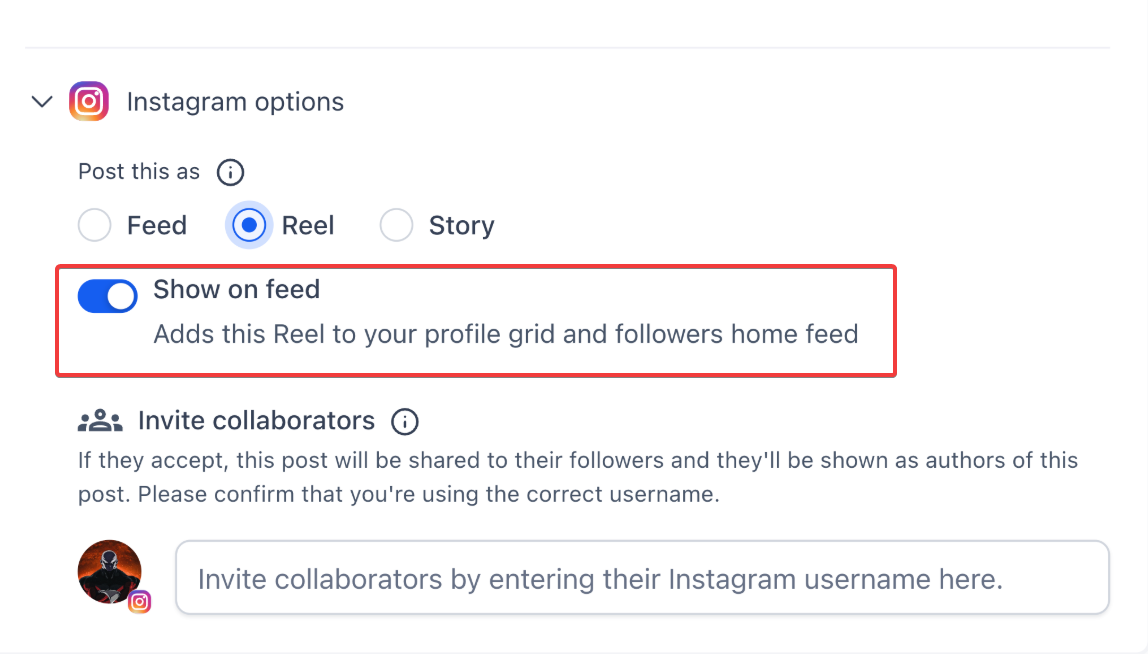 To use this feature, create a post, select Instagram Feed or Reel, and enter a valid Instagram username in the collaborator field. Ensure the Instagram account is properly connected in settings.