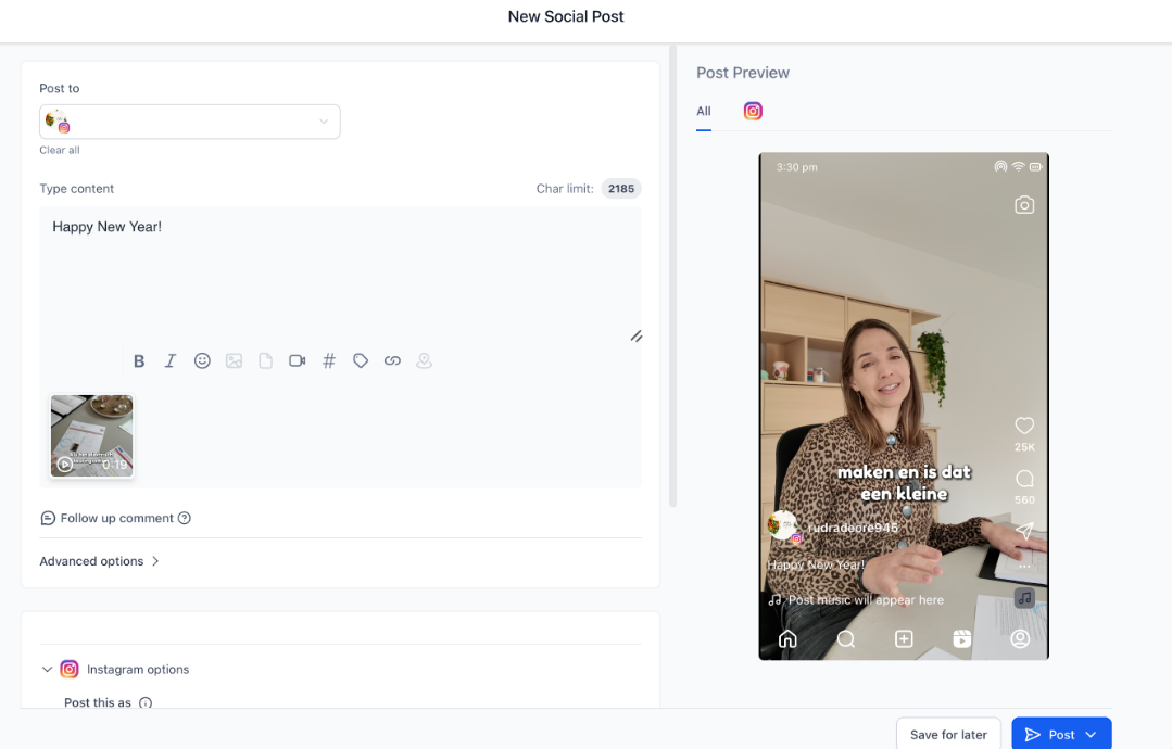 Answer: Yes, you can schedule your Instagram Reel for later publication using The Social Planner. After creating your reel, you can choose "Save for Later," and it will be saved for future posting.