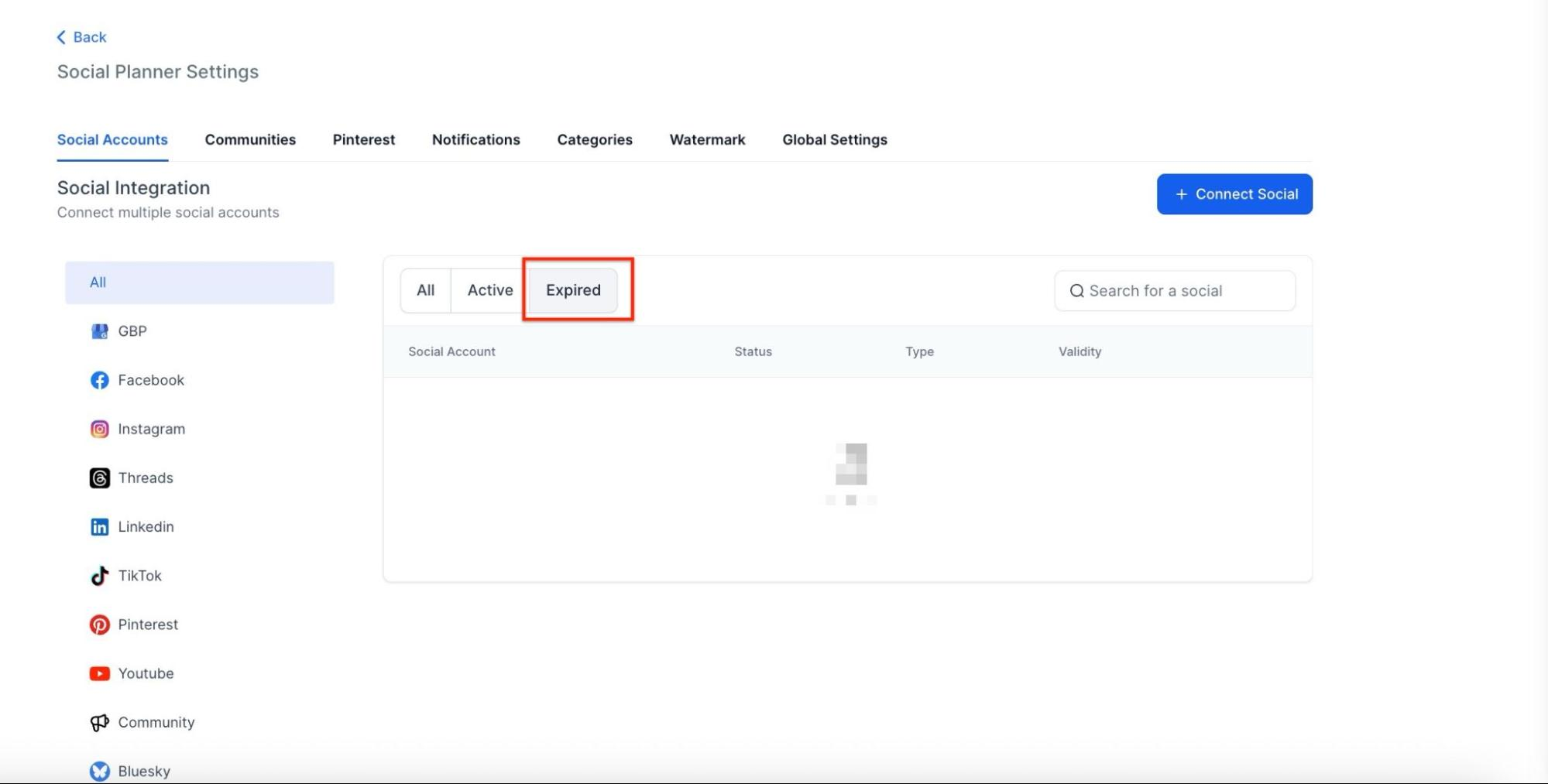 To reconnect a page or group within the Social Planner, use the same user account that originally connected it. If the account has expired tokens, follow these steps: