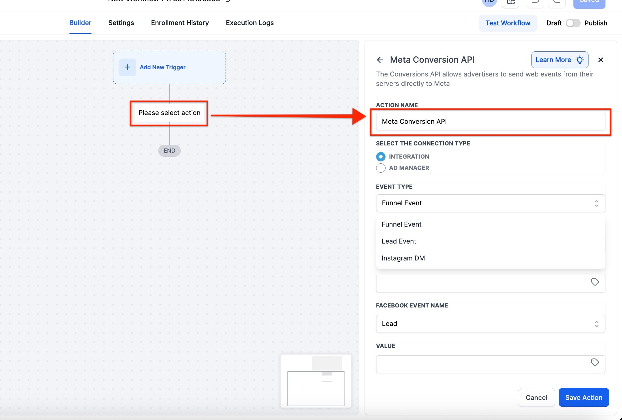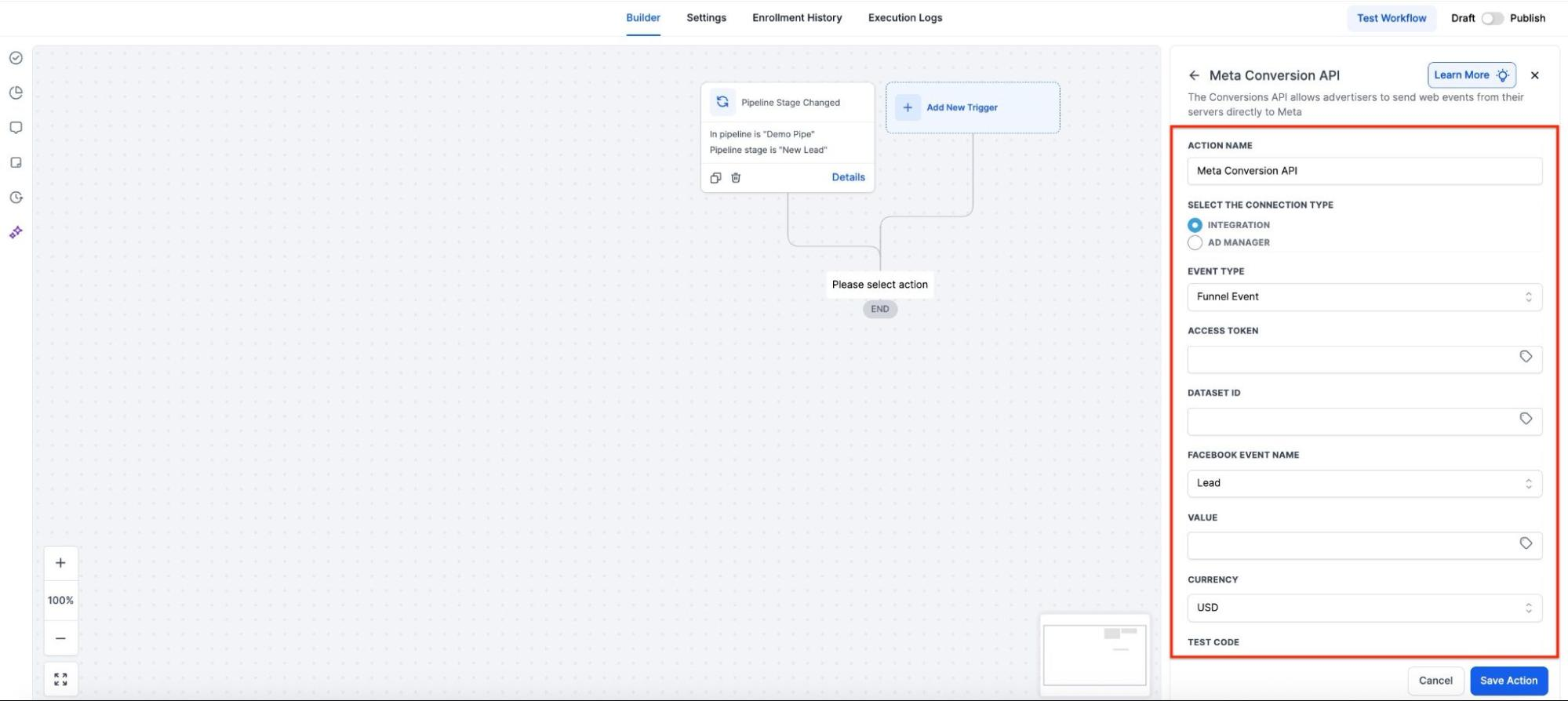 - Create a secondary workflow with a Pipeline Stage Change trigger and a Facebook Conversion API action.