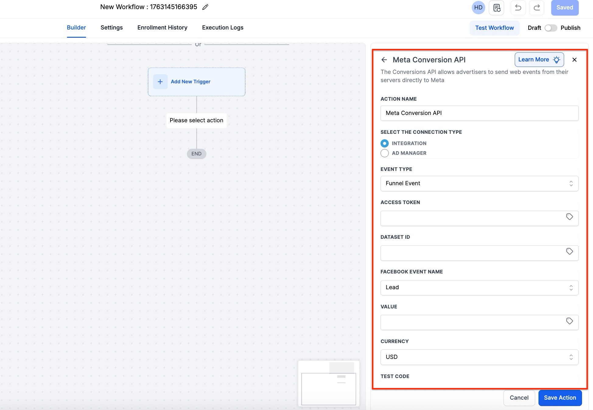 - Establish a Workflow Trigger based on the submission of a Facebook Lead Form, marking the initial phase of your conversion flow.