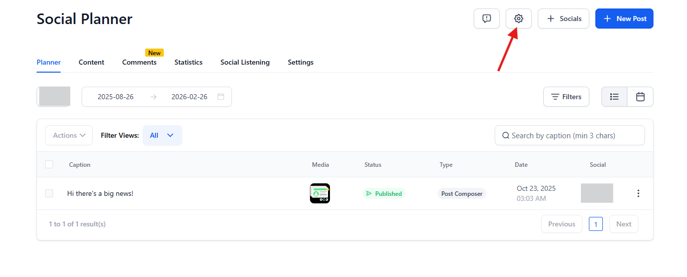 - Navigate to “Marketing & Sales” → “Email and Social Media” → “Social Planner” at the top → Settings (gear icon)