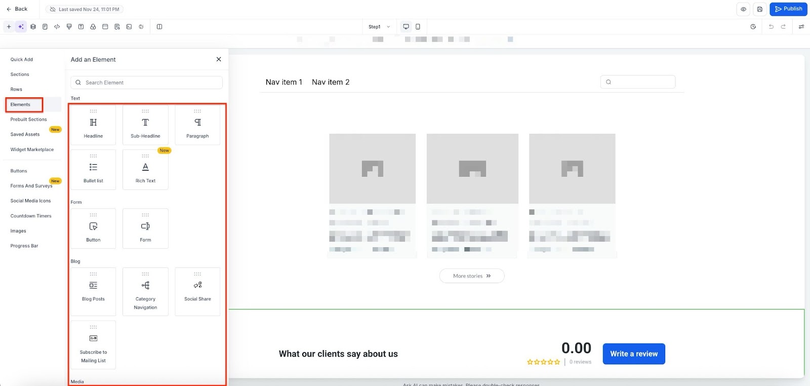 The Blog Site Builder supports various elements, ie, Text, Form, Blog, Media, Custom, Countdown, Blocks, and Social Element. They are further categorized as follows: