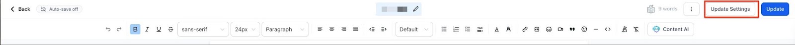 - Once you’ve added the content, you will need to set up the details for your blog. You will need to click “Continue” if the blog post is new, or click “Update Settings” if you are updating an already created Blog Post. This includes: