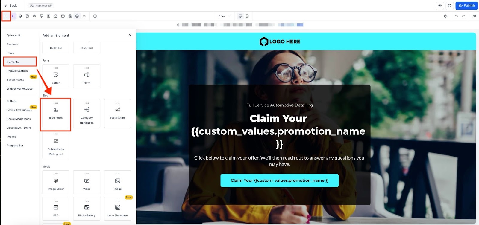Step 2: Adding a Website or Funnel with the Blog Post List Element