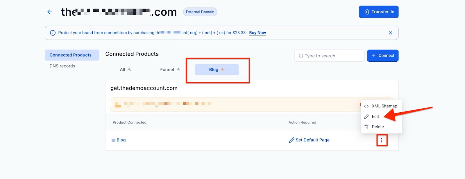 - If you want the blog page to open when you enter your domain without any path, you can navigate to Settings > Domains & URL Redirects > Manage the Domain > Select the blog page as the default page. You can set it up so that the blog opens at blog.thedemoaccount.com instead of blog.thedemoaccount.com/home