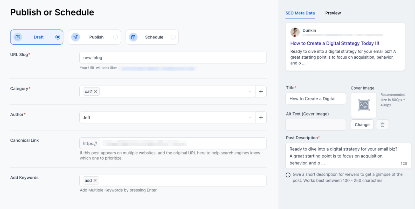 Blog Post details require Category details like name, slug, and SEO details can be set in Blogs Settings. It is optional to add Author and Keywords. Author details can be set in Blogs Settings with name, photo, and social information. Keywords can be set from the publish screen.