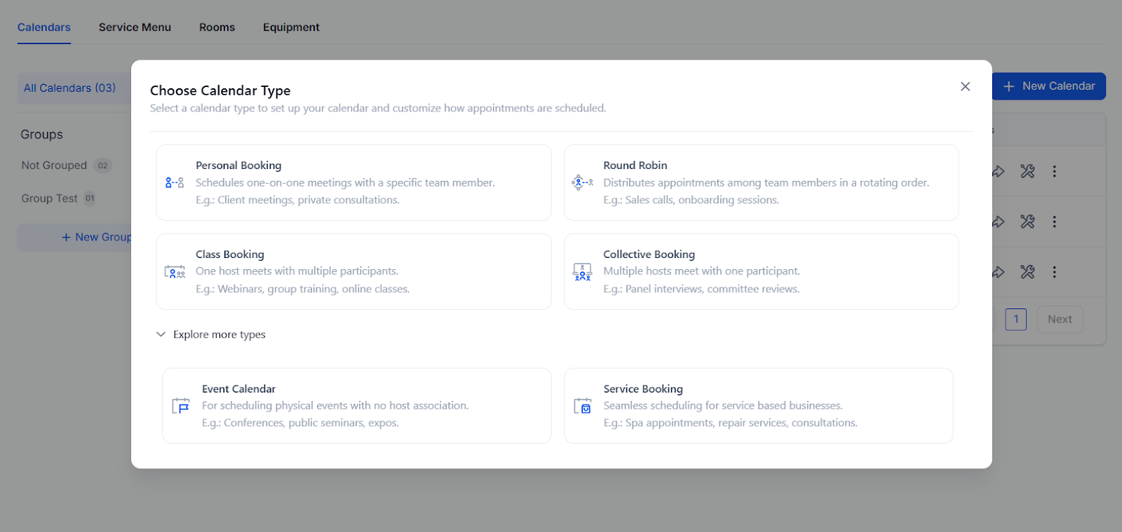 - Service Calendar: Tailored for creating services, grouping them by categories, and displaying them in a single scheduling link - the service menu.