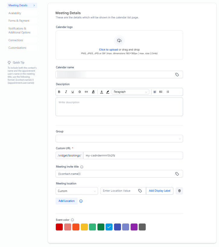 - Appointment Title: Set a meaningful title. Utilize {{contact.name}} for personalized touches.