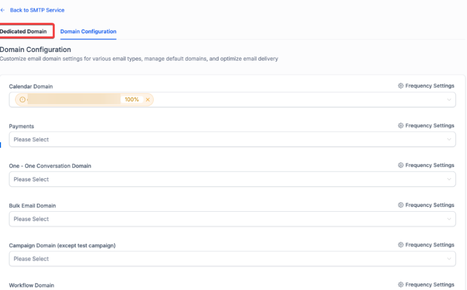 Dedicated sending domains can be set for calendar emails like confirmations, reminders, and reschedules. This helps improve deliverability and protect the domain reputation by separating calendar traffic. Users can distribute email volume across multiple domains with custom percentage settings.