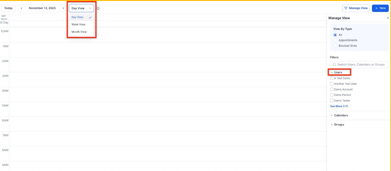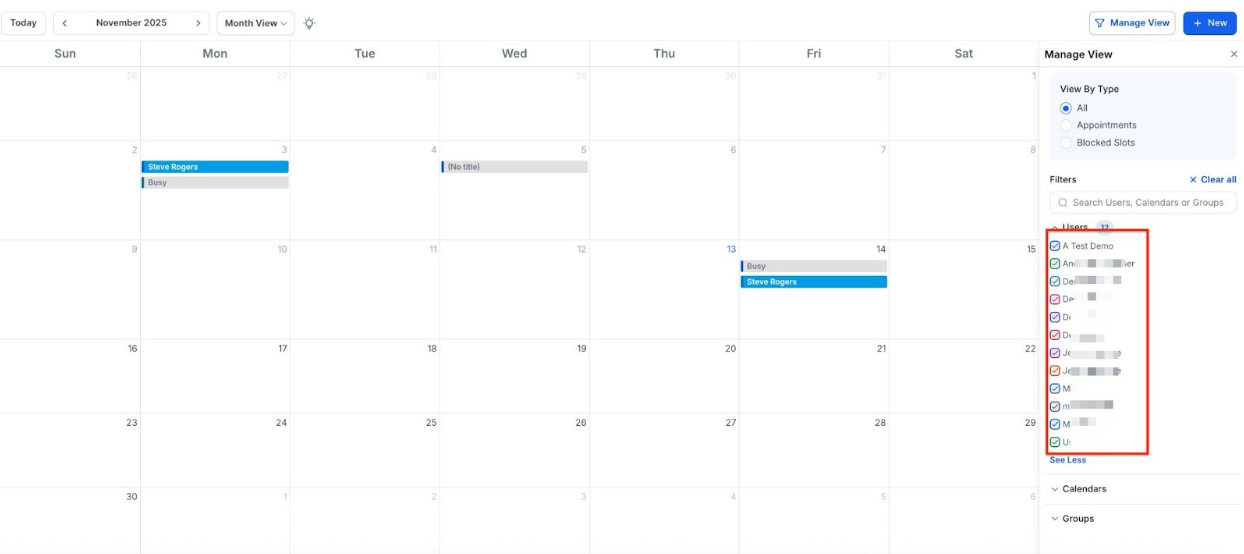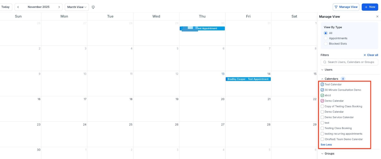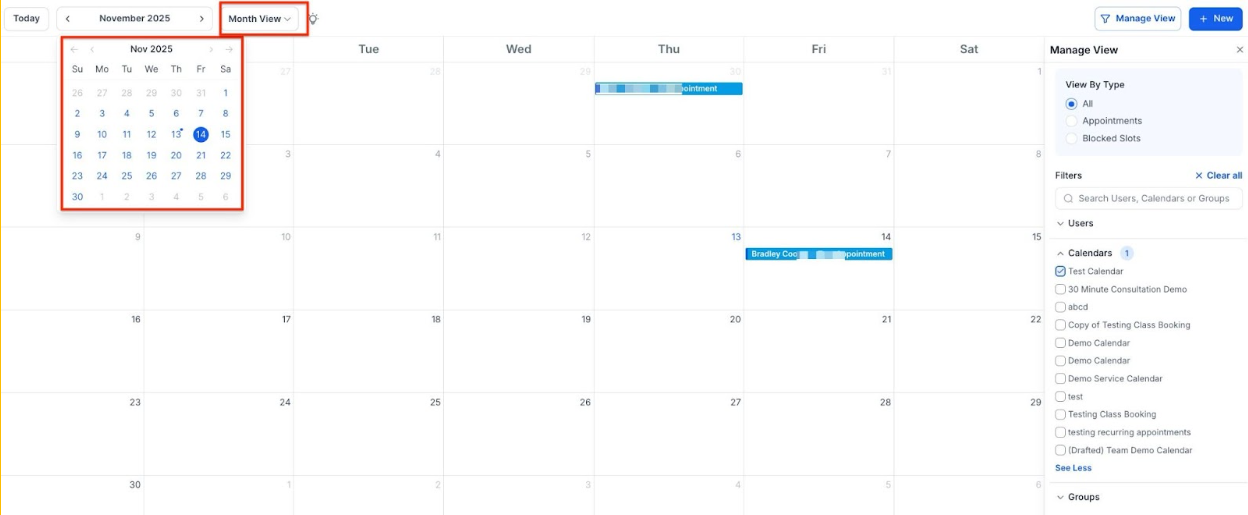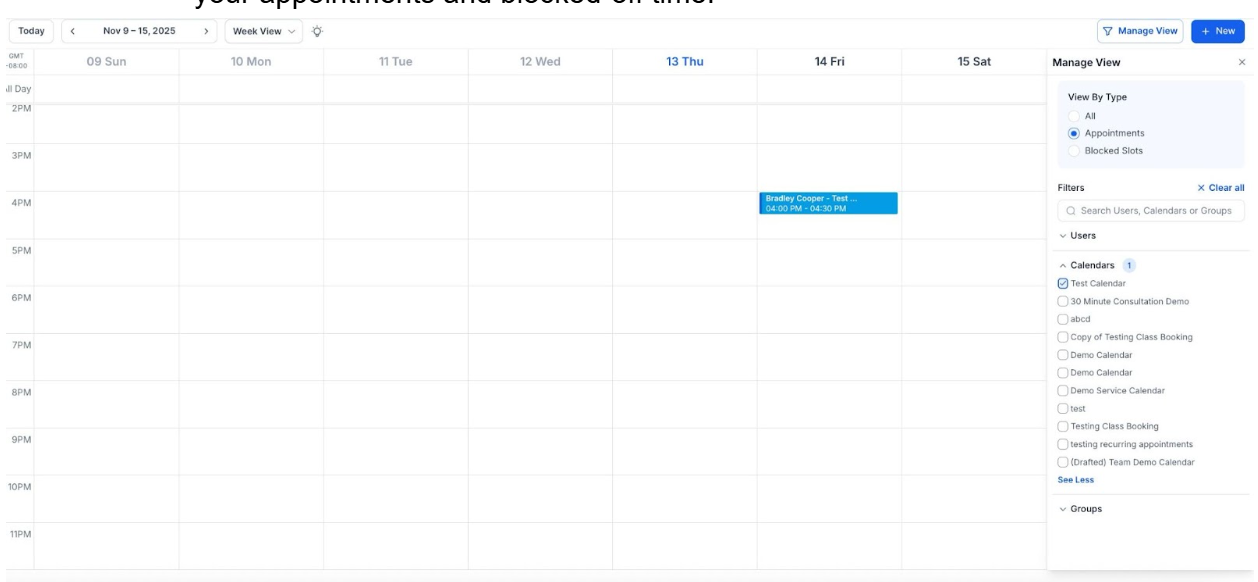 - Yes, you can filter your calendar to display appointments, blocked times, or both. You can also switch between different calendar views such as Day, Week, or Month to adjust how your schedule is displayed.