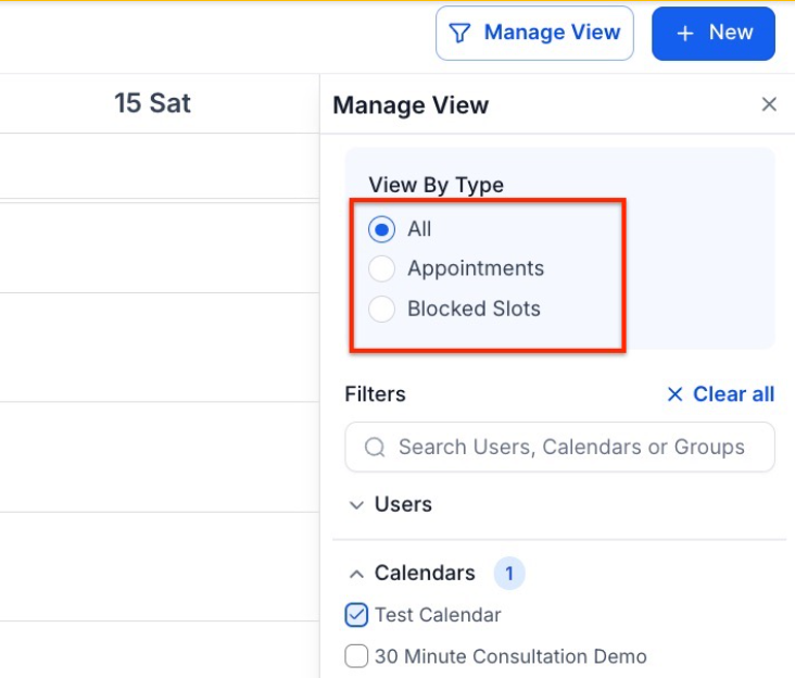 - Under “View Type,” you can filter your calendar to show all, appointments, blocked times, or both.