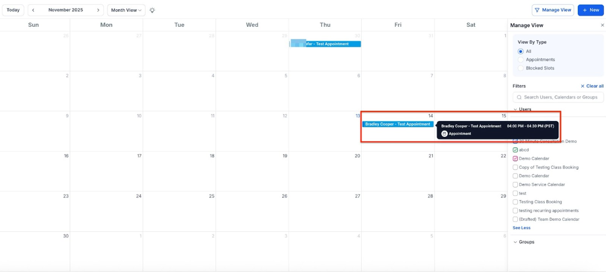 - Click on the date or time slot where you want to schedule the appointment or use the “New” button at the top right of the page. Choose “Book an Appointment” from the popup window, select the contact, enter the details, and click “Book Appointment” to add it to your calendar.