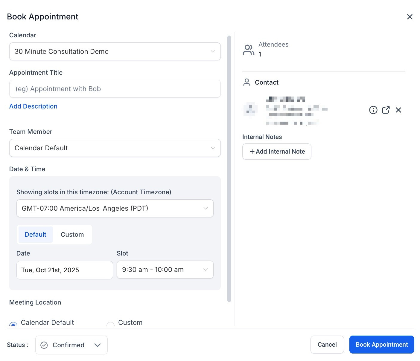 To book an appointment for a new contact, click the “Book Appointment” option in the Calendar tab, then select “Add New Contact.” You'll need their name, time zone, phone, and email for a complete profile, but you can proceed with just a phone or email.