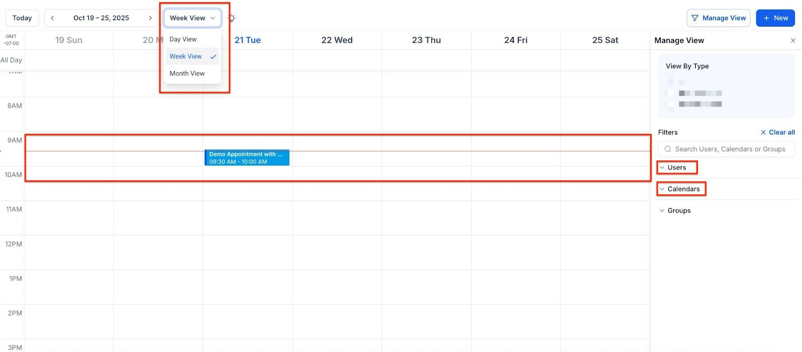 - You can filter by date, users, calendars, and groups to find your appointment faster.