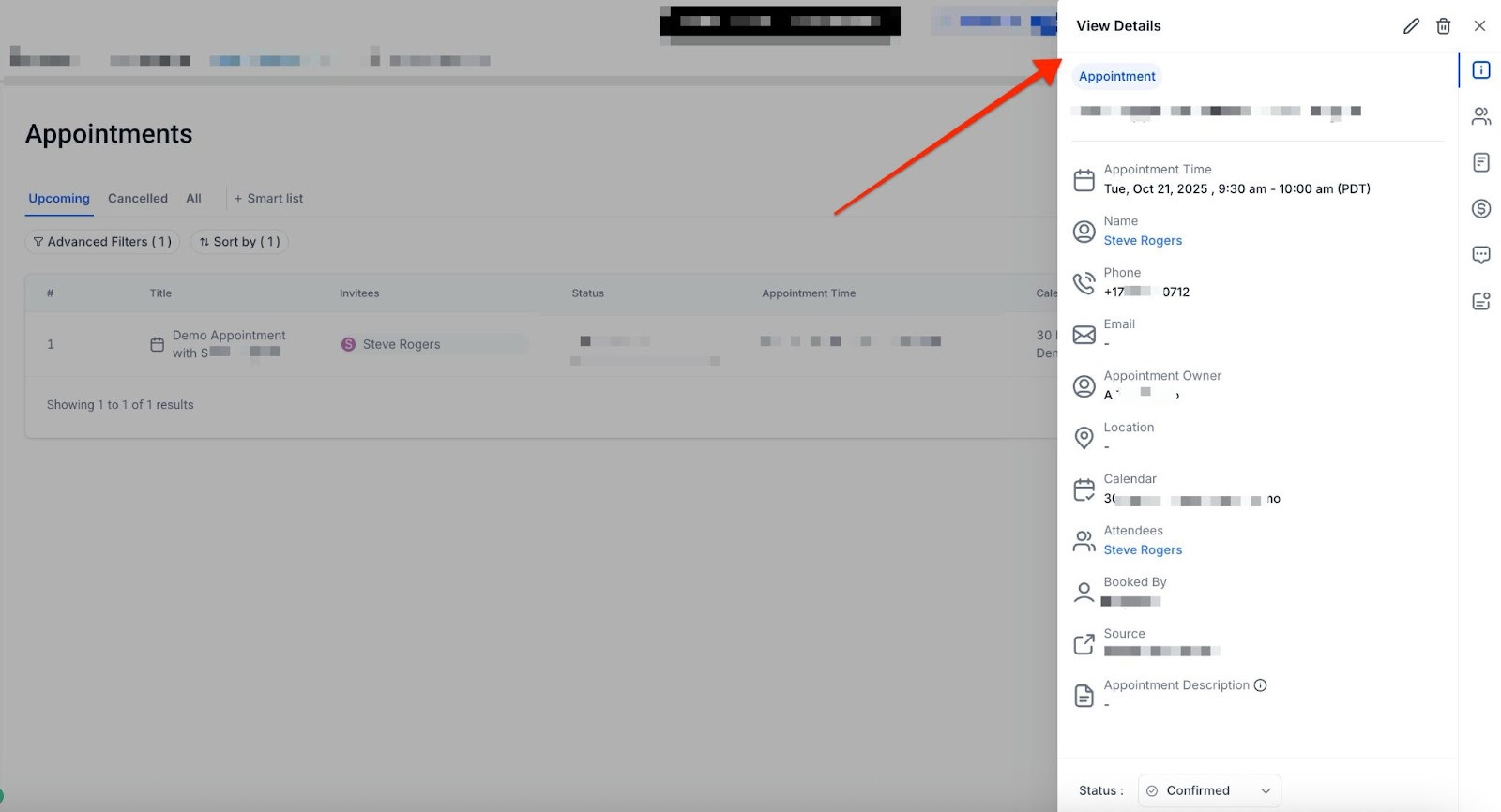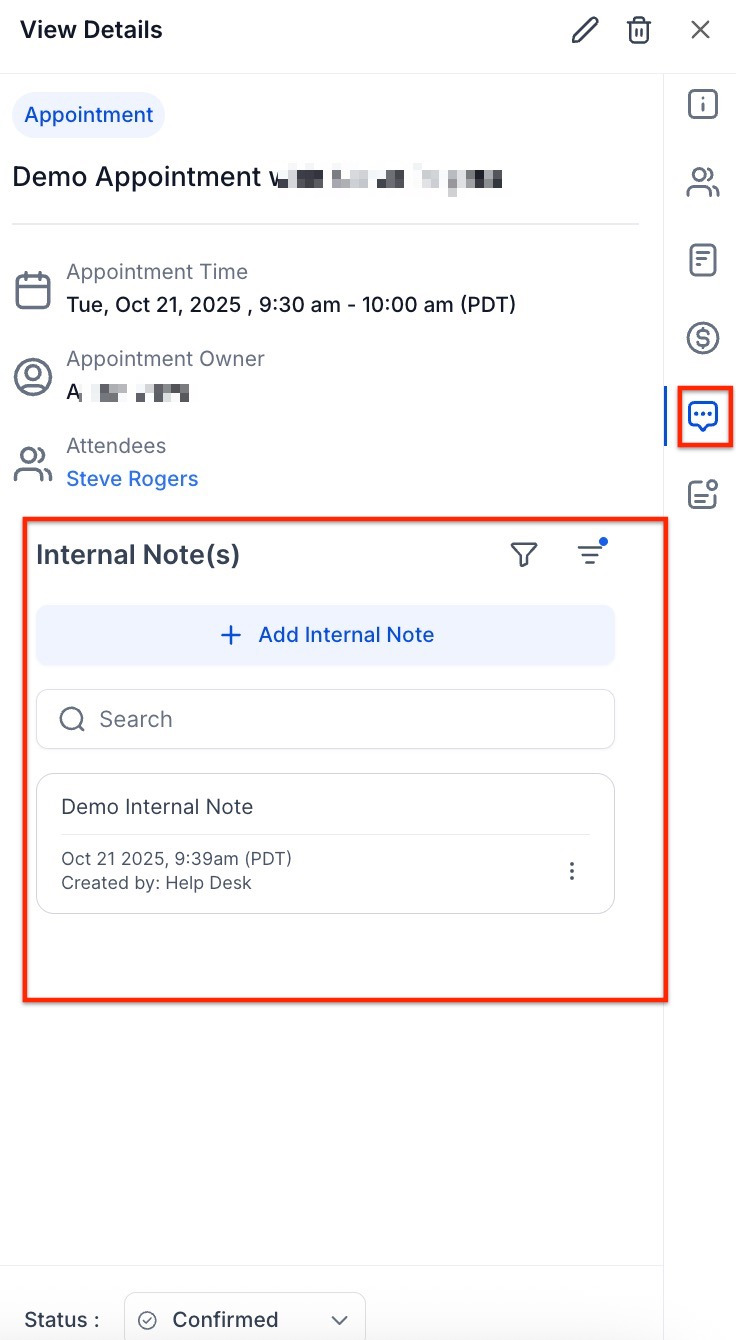 - Notes are visible within the Appointment Modal and are also accessible in the Notes section under Contacts & Conversations, ensuring information is centralized for better coordination. These notes can be viewed, edited, and deleted.