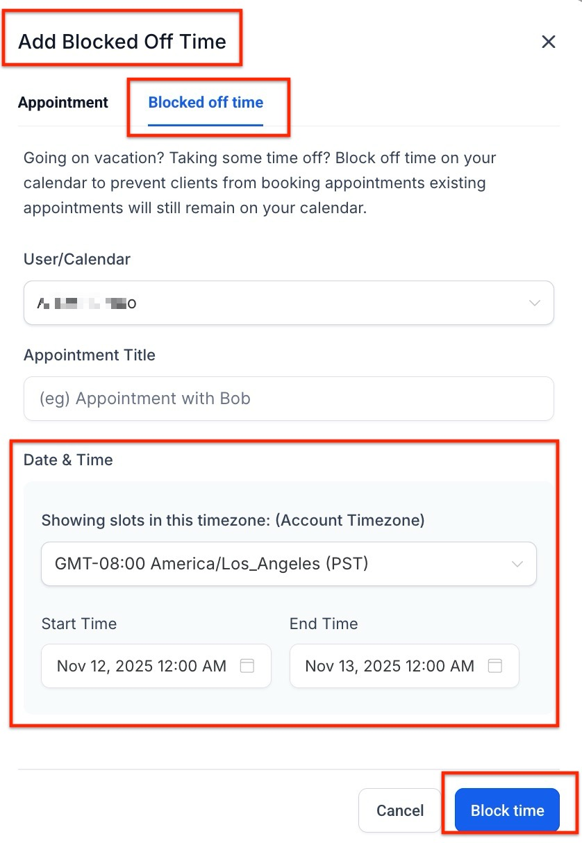 To block off unavailable times, drag across the days or times on the calendar view, select “Add Blocked Off Time” in the pop-up, specify the time range, add a title if needed, and click “Block Time.” This will prevent bookings during those periods.