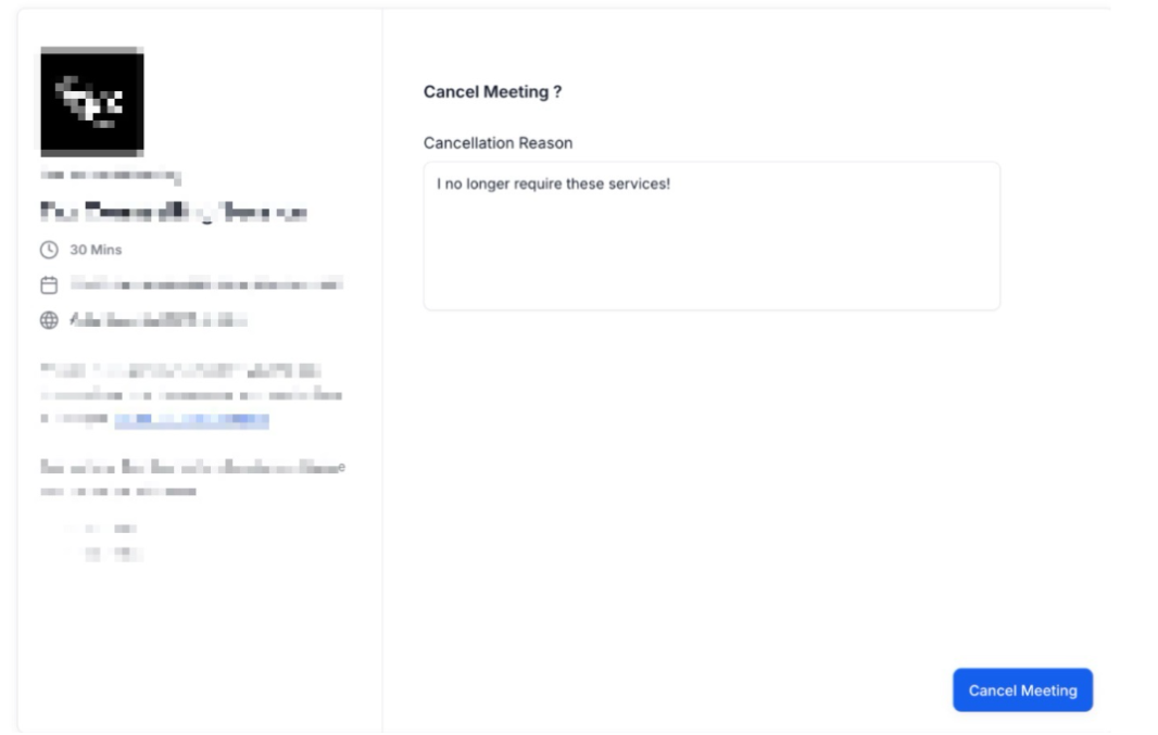 - Reason for Cancellation: If a user wishes to cancel the appointment, they will have the ability to select a reason for cancellation while also viewing important appointment information, such as Calendar Name, Duration, Description, and Appointment Date & Time. This improves visibility, allowing teams to identify patterns in cancellations and take steps to reduce them in the future.