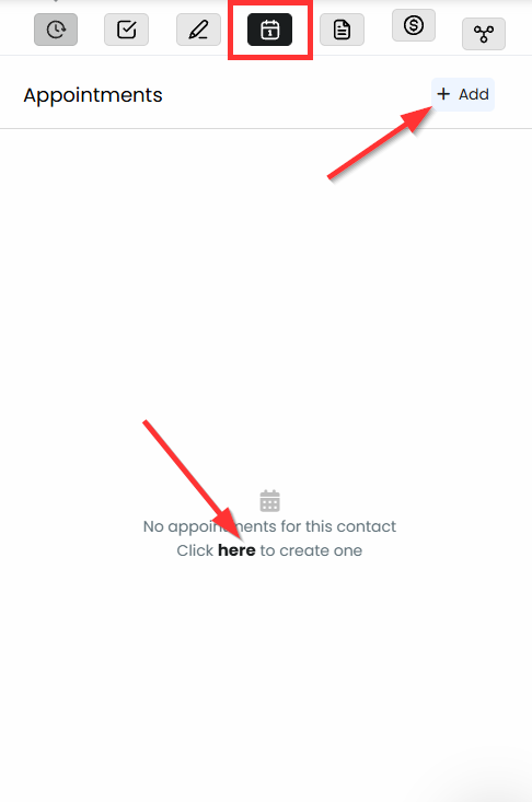 - Or Go to the Contacts tab > Go to the specific contact profile > go to the appointments section on the top right menu > Add an appointment there.