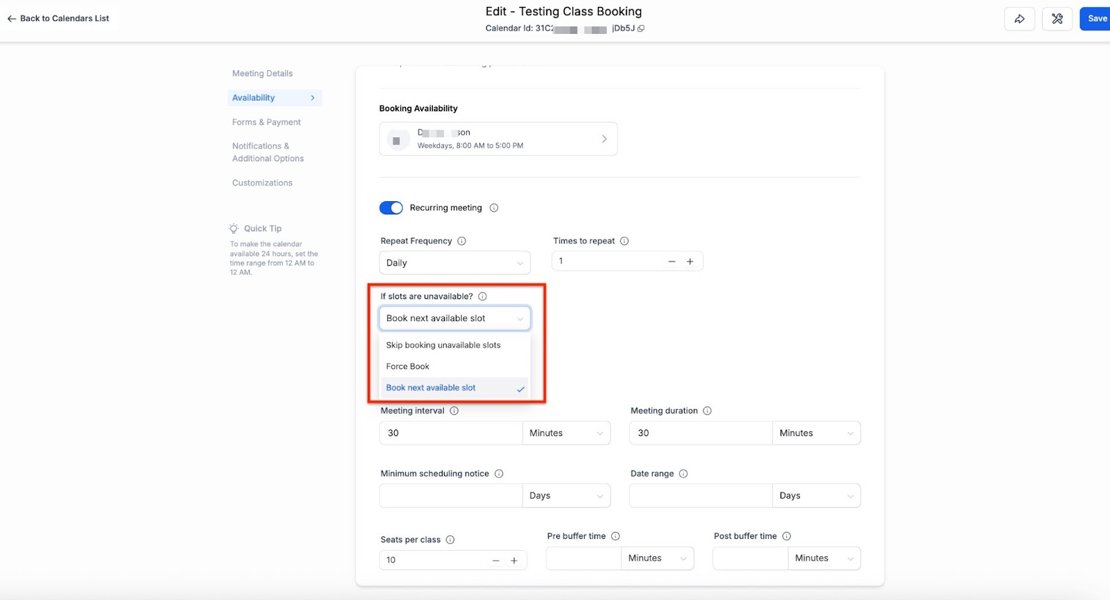 - Enable Recurring Meetings: In the Availability tab, toggle the option for Recurring Meetings.