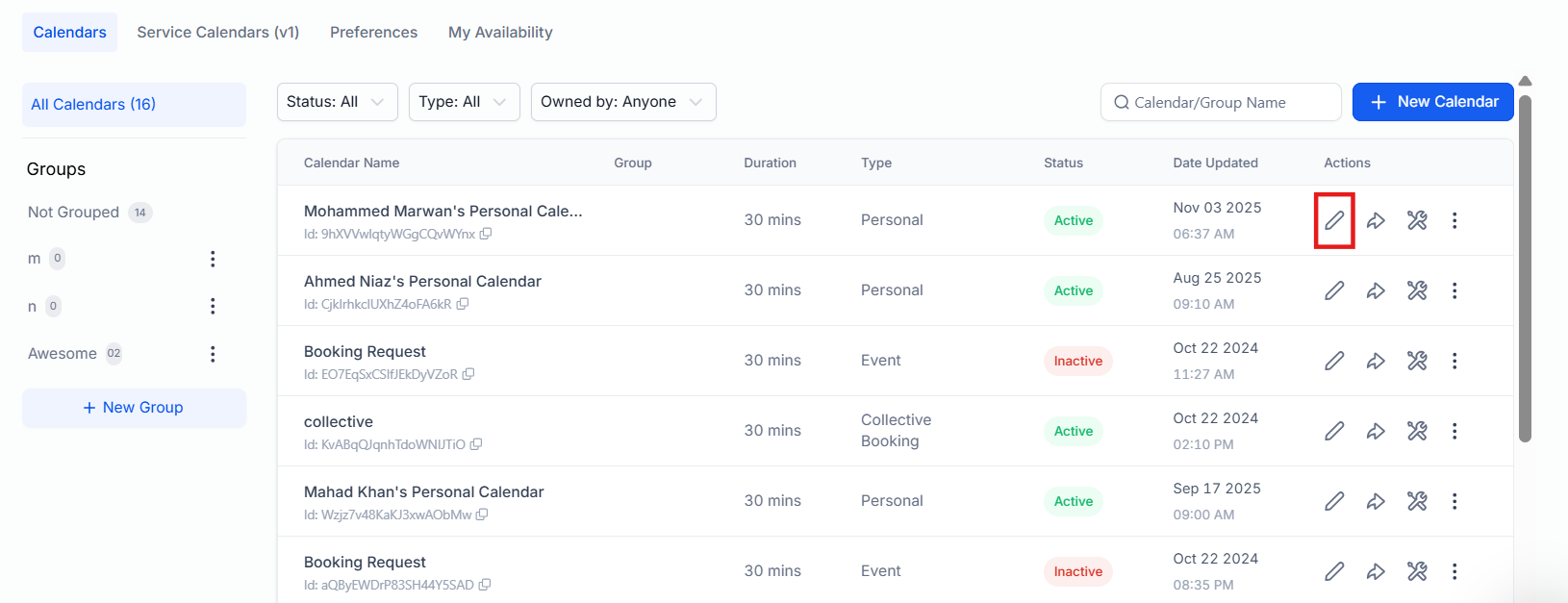 - Choose the Calendar you wish to edit and click on the pencil icon to edit.