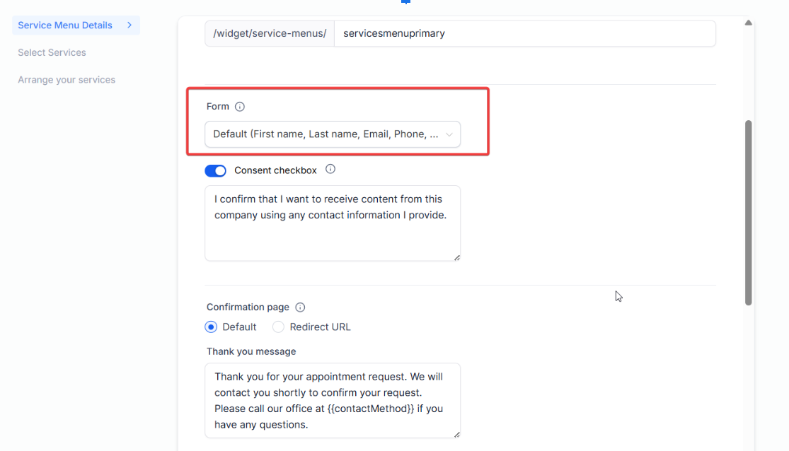 - To integrate a custom form, navigate to the form selection area within the Service Menu setup, choose the desired form you created, and save the configuration. This form will override any forms set at the individual calendar level, providing a unified data collection experience across all services in the menu.