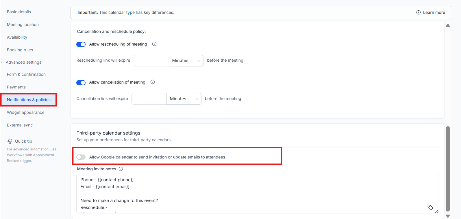 - Enable or Disable Notifications: Check or uncheck the box labeled "Allow Google/Outlook to send invitation & update emails to attendees" to enable or disable notifications from the respective third-party calendars.