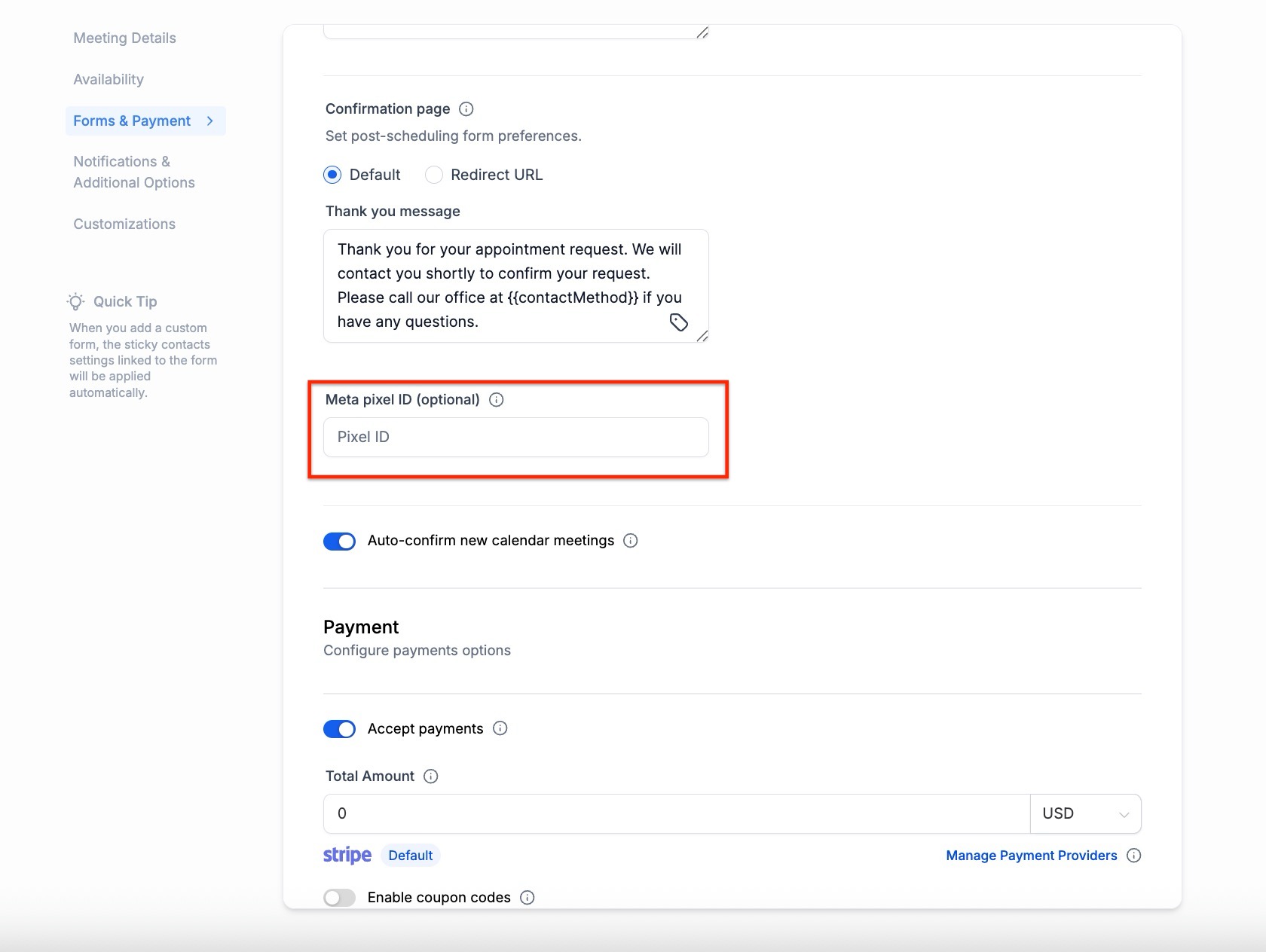 Answer: If you change your Facebook Pixel ID, you will need to update it in the Pixel section of each form, survey, and calendar where it was previously entered. Save the changes to ensure the new Pixel ID is correctly linked and tracking events.