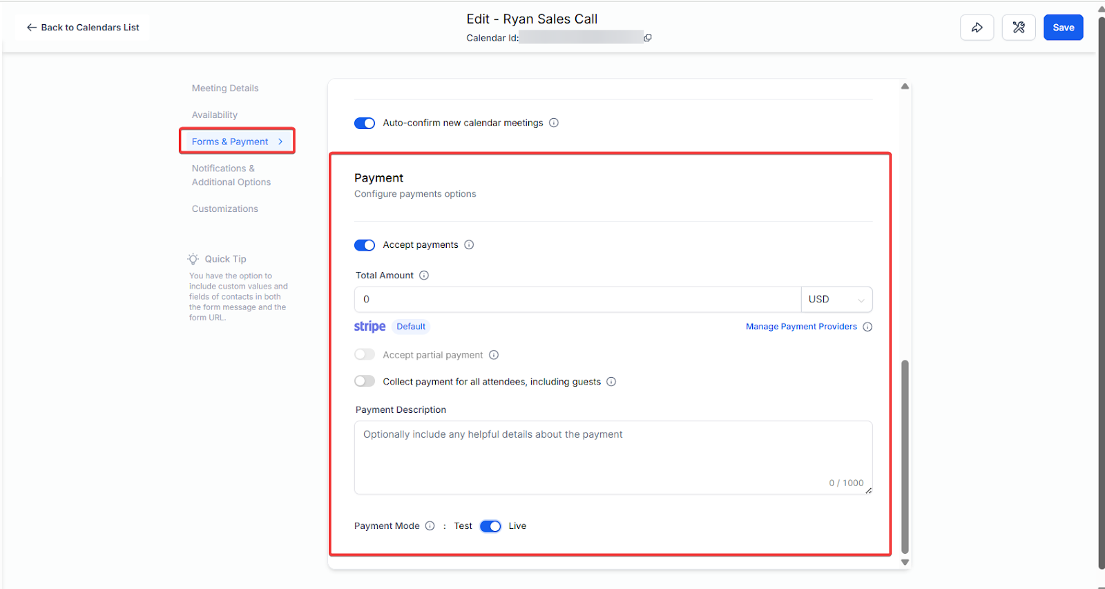 - Payments in calendars are supported through five payment gateways, namely Stripe, NMI, Authorize.net, Razorpay, and Square.