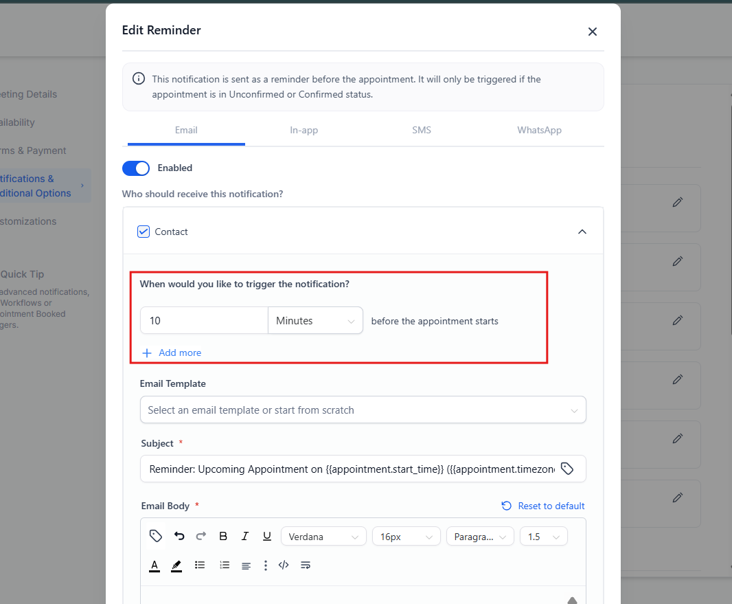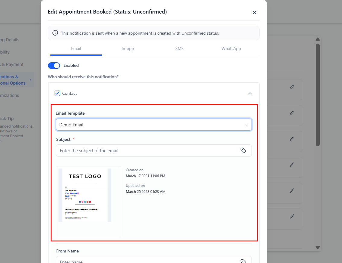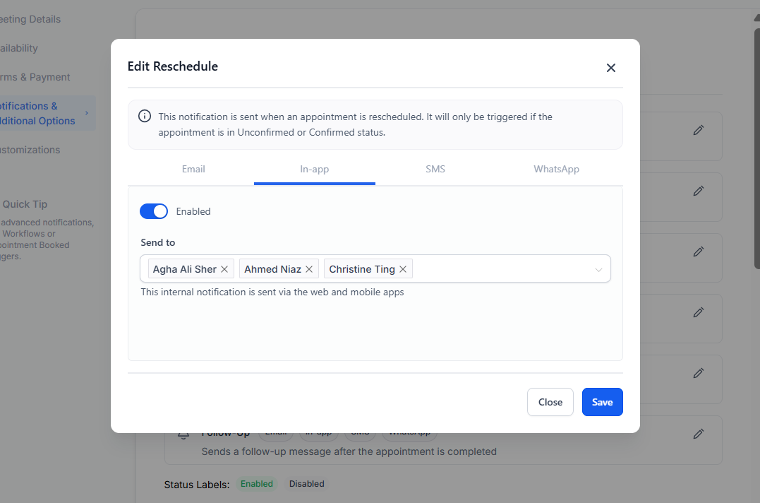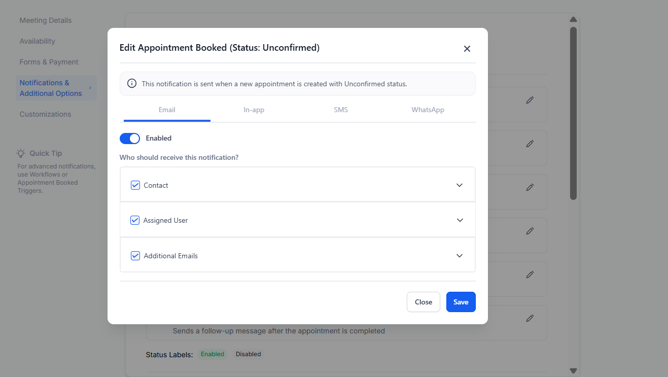 Users can fully customize their email and in-app notifications related to appointments. This allows users more control over notification content and recipients, with six types of notifications available, including Appointment Booked, Cancellation, and Follow-Up.