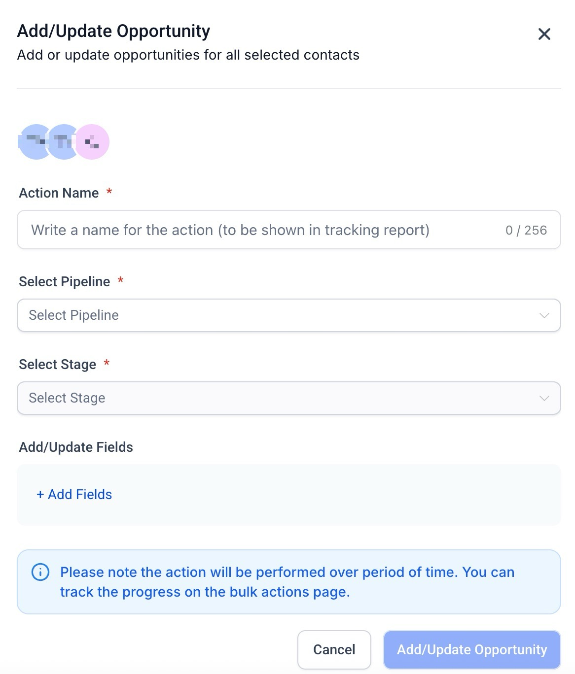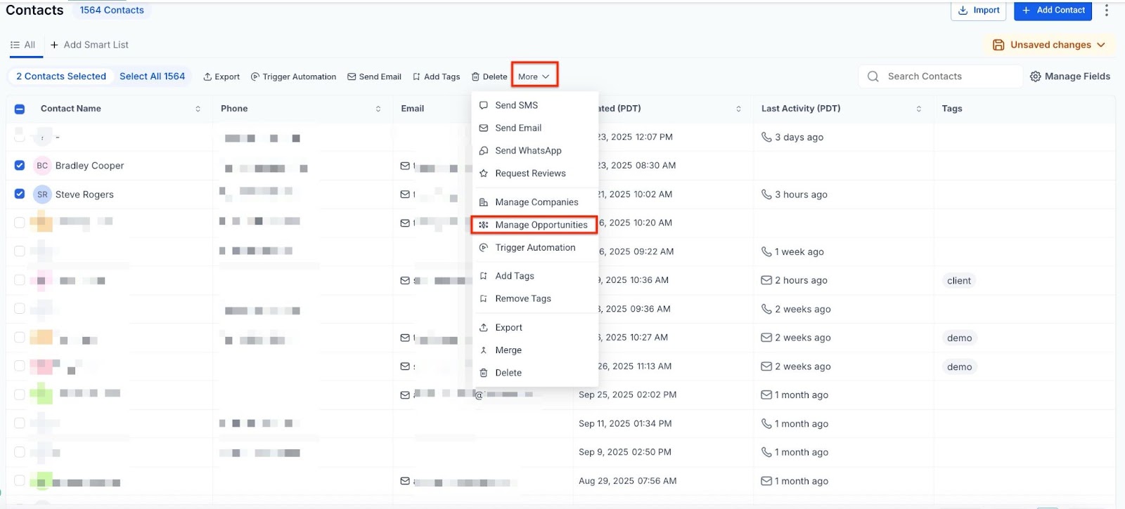 - Pipeline Change: Add/Update the Opportunity for multiple Contacts. Choose a pipeline, stage, opportunity, lead value, and more.
