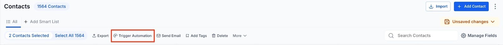 Add to Campaign/Workflow: Choose a campaign or workflow to bulk-add contacts into. You can do this by clicking ‘Trigger Automation’: