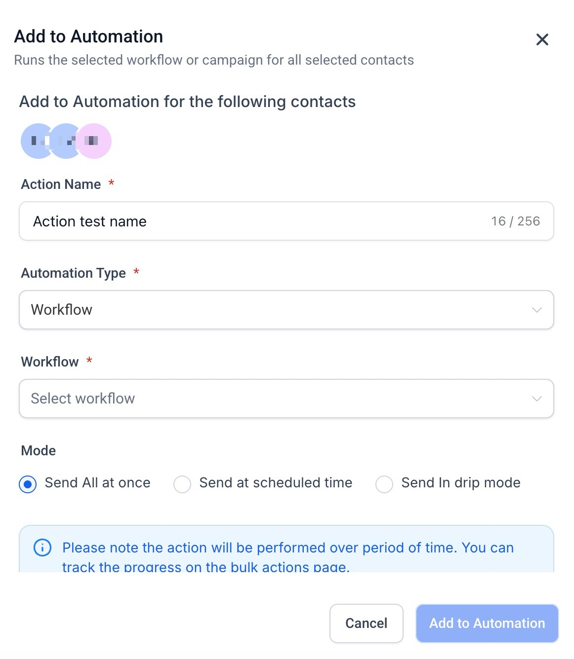 Bulk Drip Mode Architecture: The Drip Mode in Bulk Actions has been upgraded for better reliability, scalability, and flexibility. It now supports longer sequences (beyond 30 days), handles larger contact volumes efficiently, and uses a modular design for more consistent and stable automation.