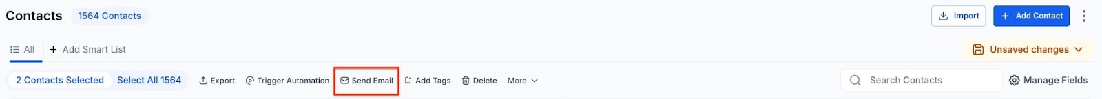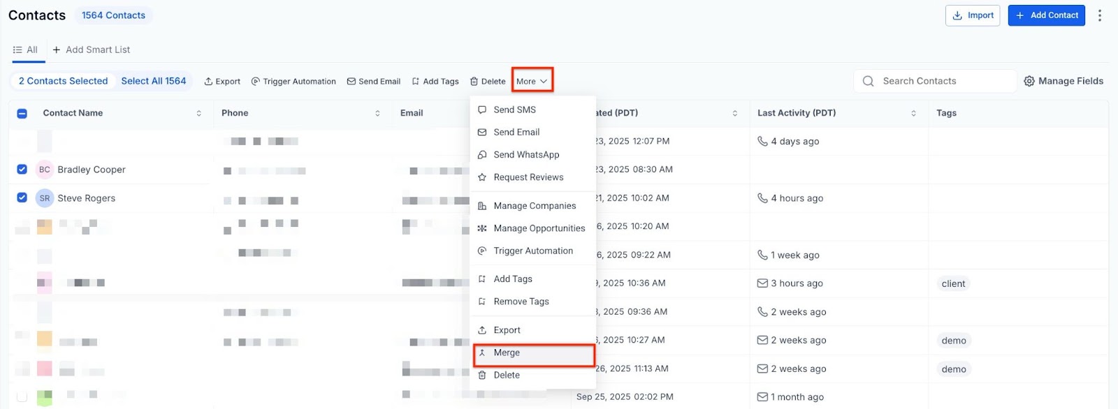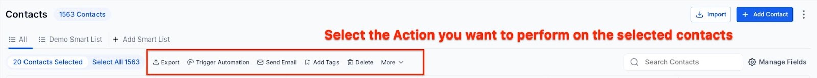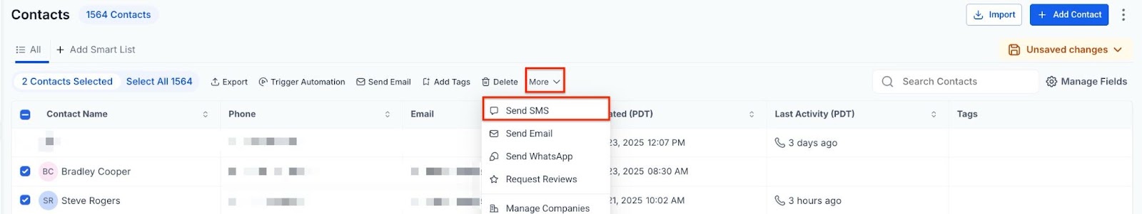 Using the Bulk Actions features in your Contacts/Smart Lists section, you can perform multiple one-off actions to selected or all contacts. From sending an email or SMS to updating the pipeline stage and more, follow the steps below to learn how to use this feature.
