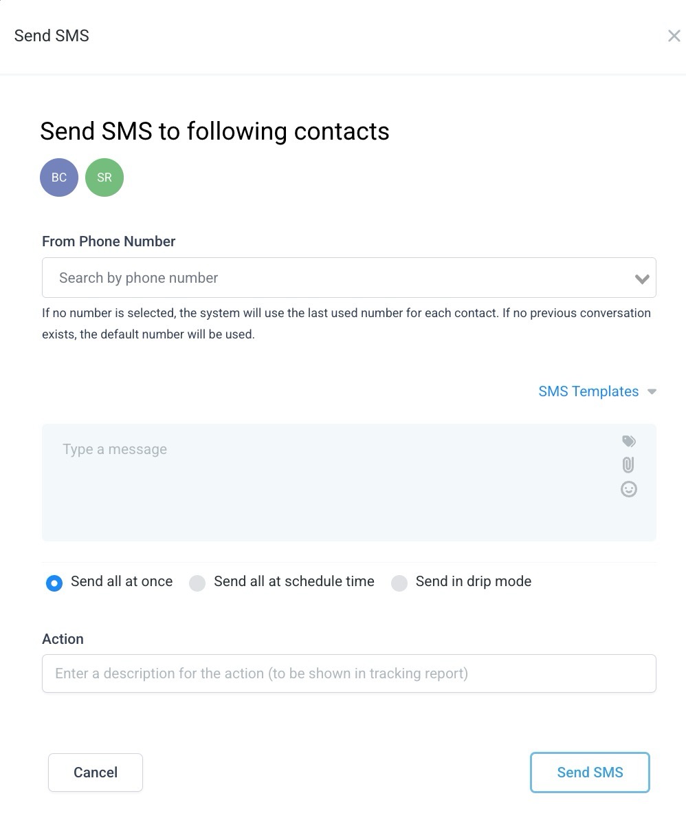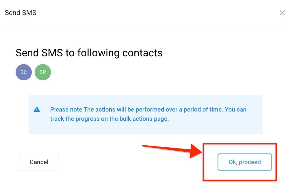 - Send SMS: Type out a one-time SMS or select from your templates. You can hover over on ‘More’, then click ‘Send SMS’. After that, you need to hit ‘Ok, proceed’. Then you will have the option to send SMS all at once, at a specific time or in drip mode.