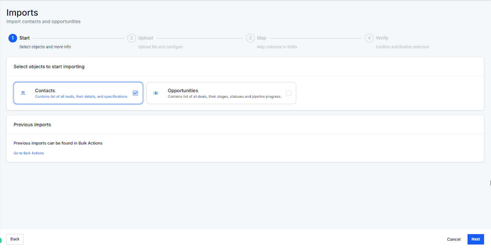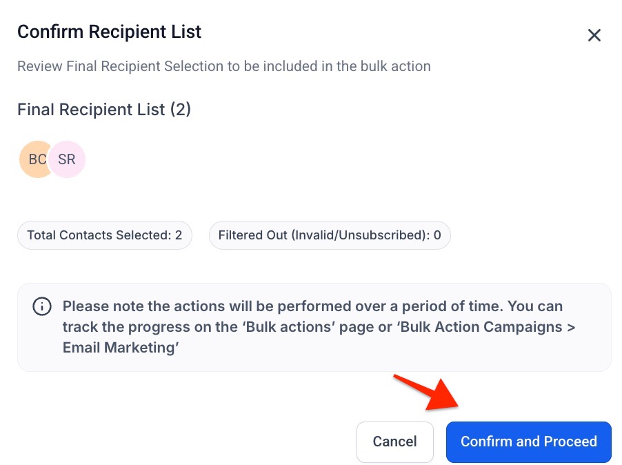 Step 1: Navigate to Contacts > Bulk Actions. Here you can view a list of all your Bulk Actions.
