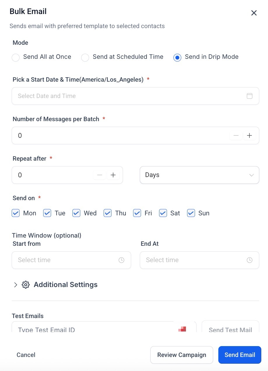 Answer: All at Once sends your message to every selected contact at the exact same second. Drip Mode breaks the list into small batches (e.g., 20 people every 10 minutes). Drip Mode is highly recommended for large lists to prevent your email or phone provider from flagging your account for "spammy" behavior.