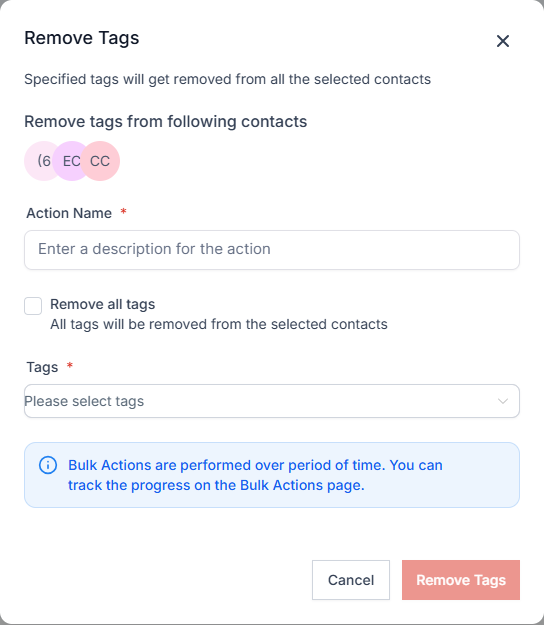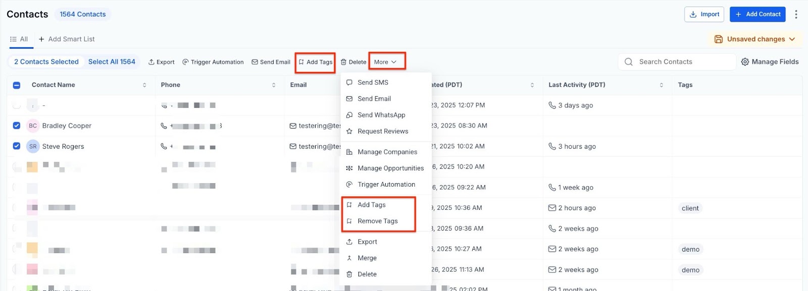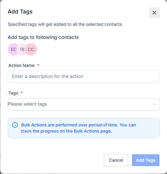 - Add/Remove Tag: Add or remove one or multiple tags from the selected contacts.