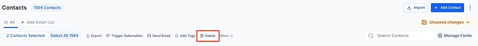 NOTE: Deleting Contacts / Importing / Exporting / Merging Contacts are only available for Account admins. Account users cannot delete, Import, Export, or merge contacts.