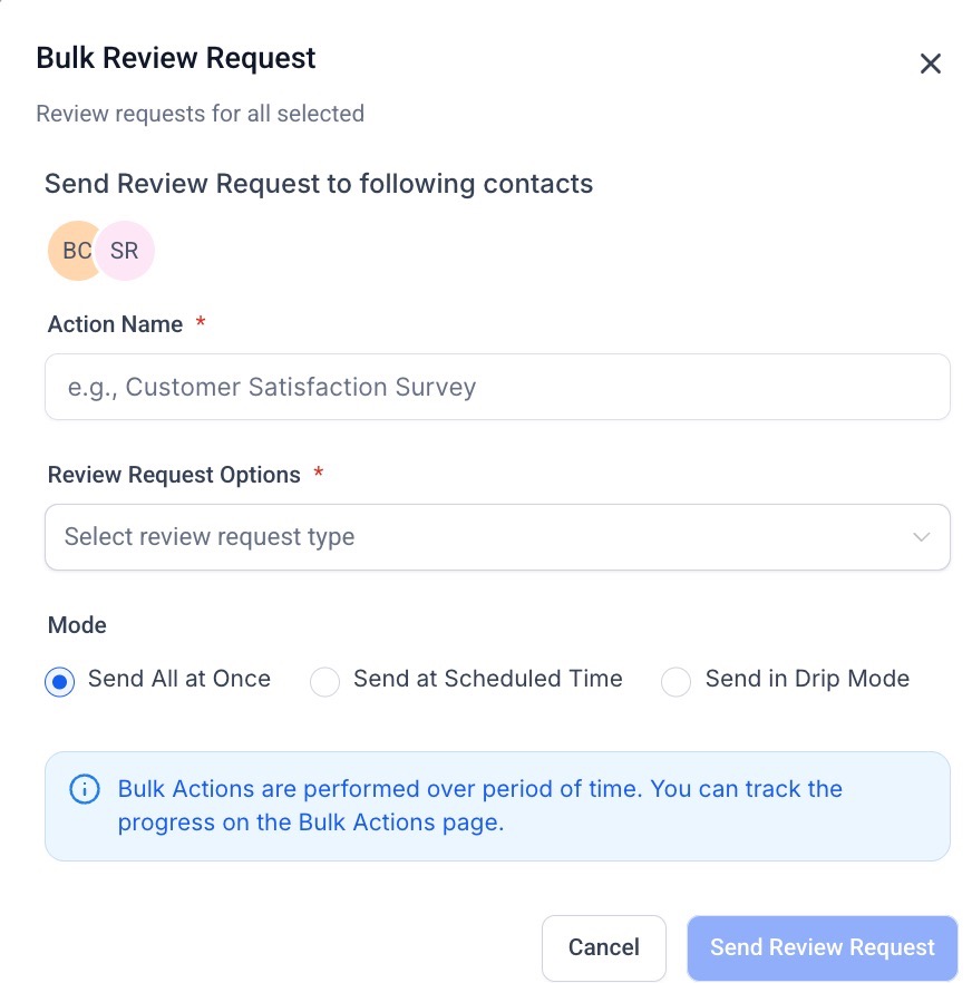 - Send Review Requests: Here you can send a review request to multiple contacts at once, on a scheduled time or in drip mode. (Be sure you have your “Reputation” section set up for reviews.)